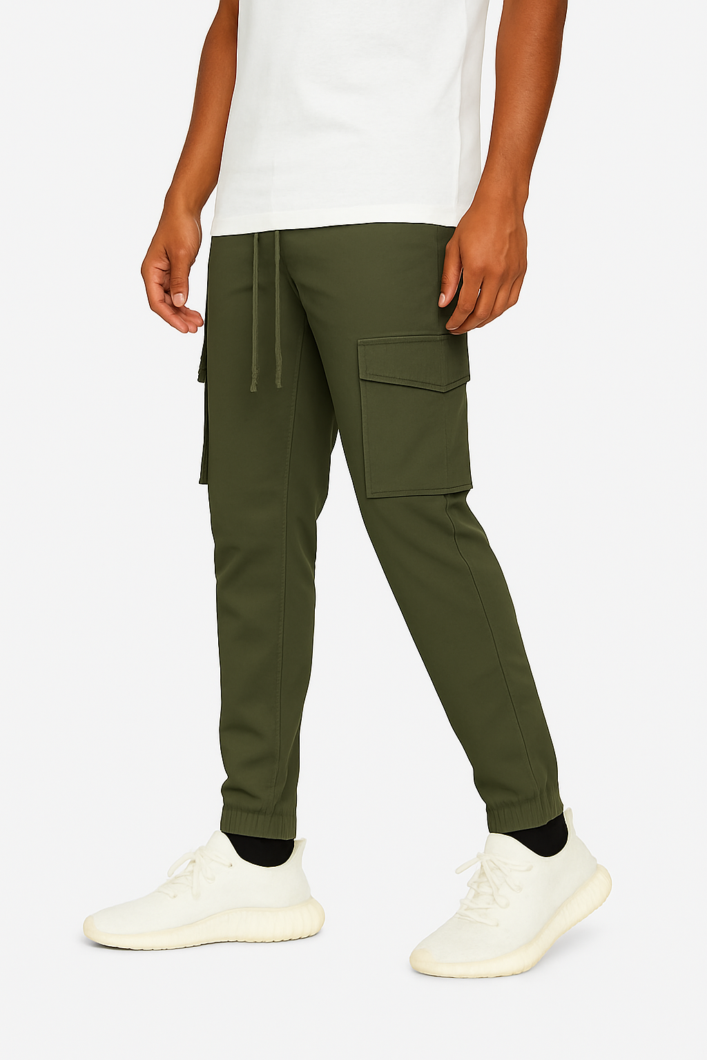 The tapered, slim-fit design with ribbed cuffs at the ankles gives a modern, athletic silhouette, while the drawstring waistband ensures a snug and adjustable fit. What sets these pants apart are the smartly placed utility pockets, including a flap cargo pocket on the side and additional space for your essentials like keys, wallet, or phone — all without adding bulk.